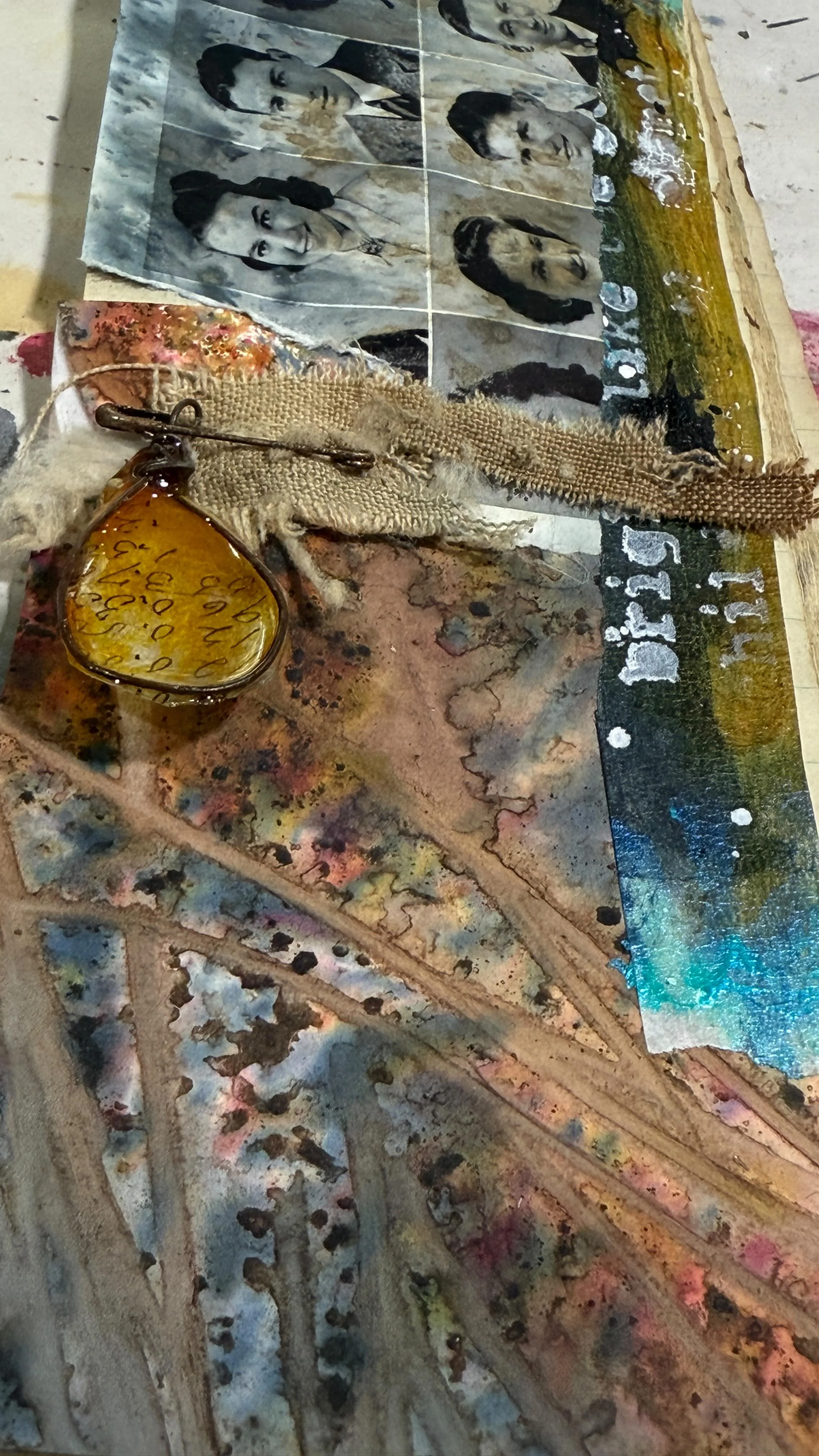 So how does that all transition into my art practice? The loose translation of “wabi” is simplicity and “sabi” means the beauty of age and wear. It is often termed as imperfect and incomplete. It is me and I am it, I am a lover of all the imperfect in life. This week I actually found myself mesmerized by a tree that has fallen in the outer edges of our property… it was decaying and had marks from years of wear. It is so beautiful and imperfect, the scars from the many storms it has seen. I can relate? Can you? Today’s art journal share, is me leaning into the raw organic feel of the marks and the beautiful rusty texture, torn worn and fragmented just like me.
